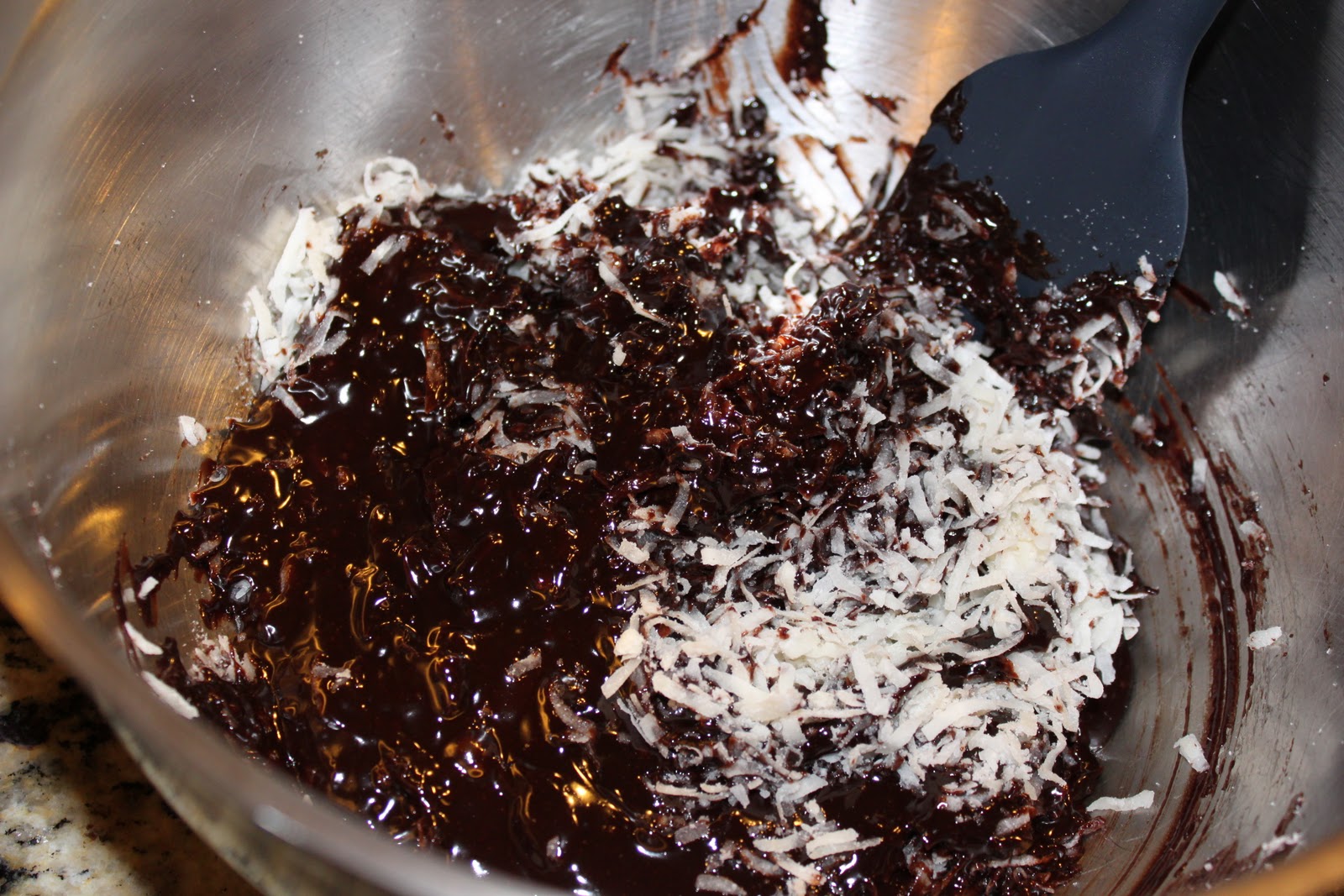 Mix the graham and the coconut into the chocolate. Ditch the spoon and use your hands if it gets too tough.